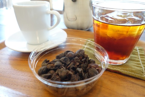 コーヒー豆ってさくらんぼみたいな果実の種なんだけど、そのさくらんぼみたいな果実からコーヒー豆(生豆)にする過程で、皮とか果肉の部分を取る事になるよね。そんでそれらを乾燥させてお茶にしたのがカスカラティーって言うんだけど、そんな5周年なもんだからお豆のお客さんへ先着100名さまにチョコびっと10gプレゼントしちゃうよねっ!ってか案内も無くすでに始めてるんだ(笑。ドライチェリーやローズヒップみたいな甘酸っぱい風味のホント美味しいお茶で、結構レアものでもあるから楽しみにしてだよねぇ〜(笑顔。