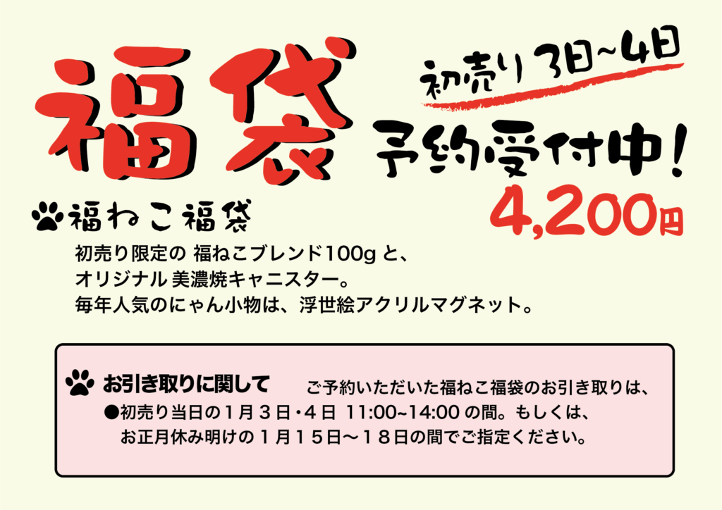 新春初売り【福ねこ福袋】ご予約開始だよ。