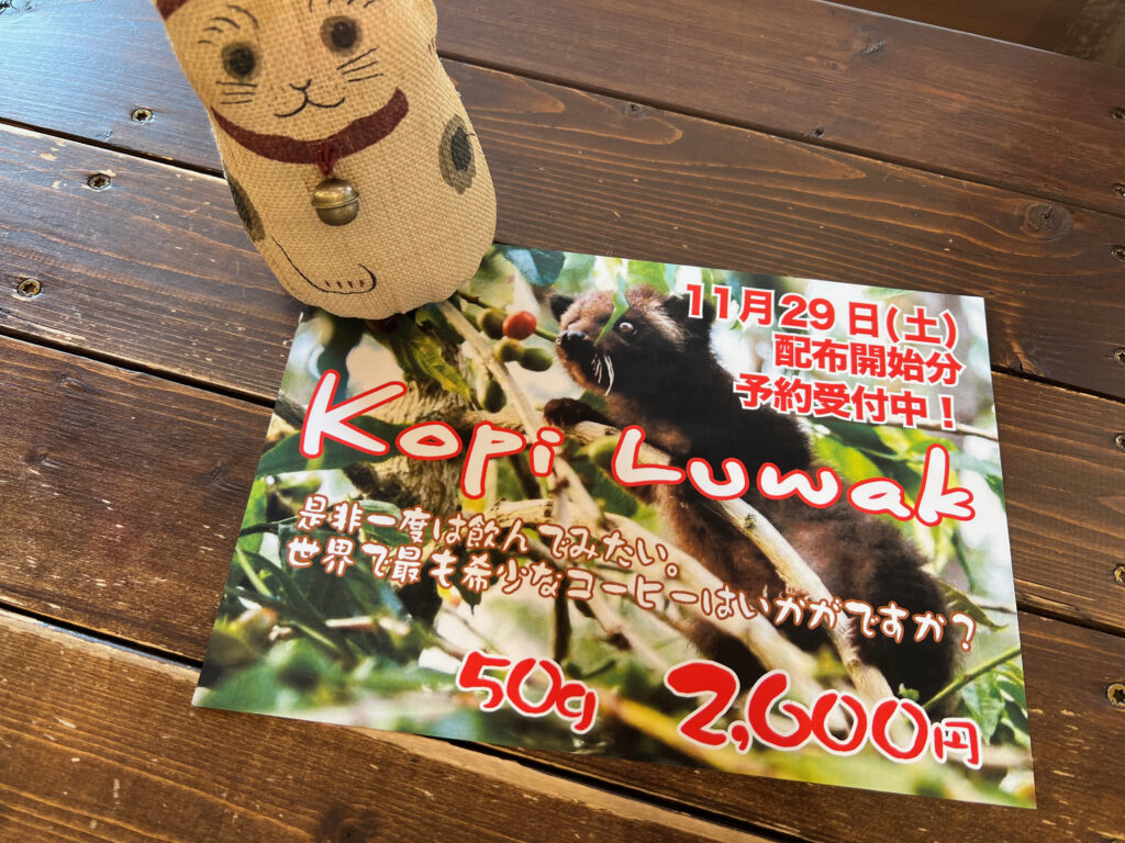 コピルアクのご予約開始しました。 2025 11/08 お知らせ 2025-11-08 毎年恒例のコピルアクのご予約を開始しました。店頭及びお電話にて受け付けていますので、興味のある方は是非ご検討ください。今年も2キロ限定です! お知らせ よかったらシェアしてね! URLをコピーしました! URLをコピーしました! 12月の営業について この記事を書いた人 yamaneko222 関連記事 12月の営業について 2025-11-02 8/21(木)臨時休業のお知らせ 2025-08-08 ブレンド類他価格変更に関するご案内だよ 2025-06-07 【Barrel Aged Whisky事前予約販売会のお知らせ】 2025-02-17 【通常営業に戻りますっ!】 2025-02-13 2月8日(土)臨時休業いたします。 2025-02-07 本年もありがとうございました。 2024-12-31 年末年始営業のご案内 2024-11-28